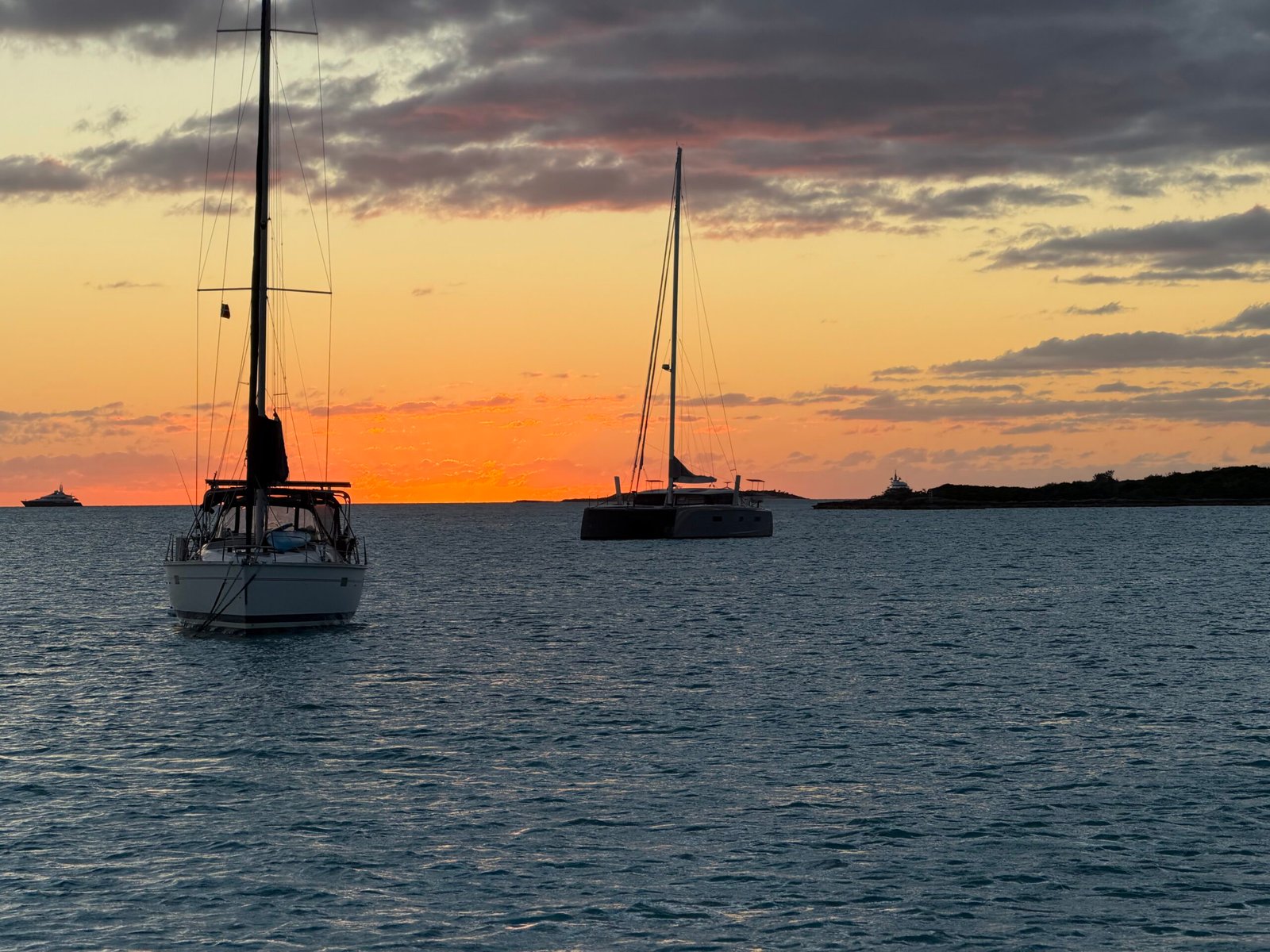 Next, we took a dinghy trip to the Thunderball Grotto, the famous cave featured in the James Bond movie. We found a spot just outside to drop the hook and swam in. The grotto itself was incredible—a natural cathedral complete with a skylight. Tropical fish and colorful coral filled the space like stained glass.