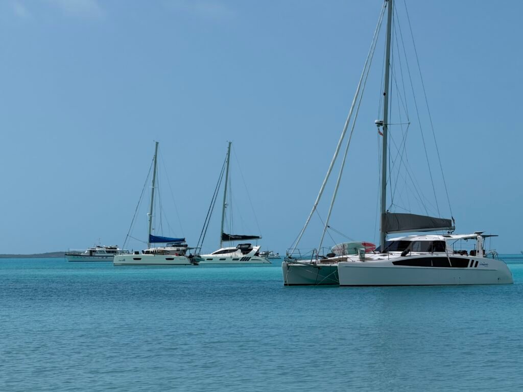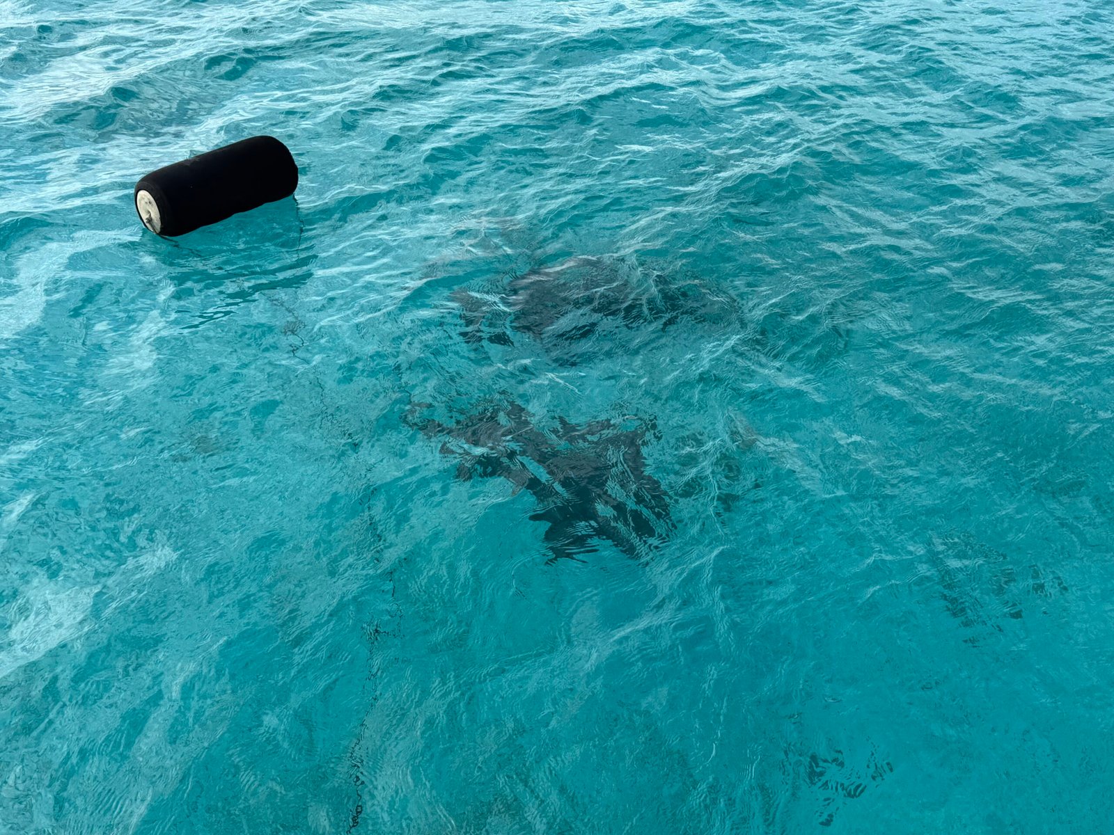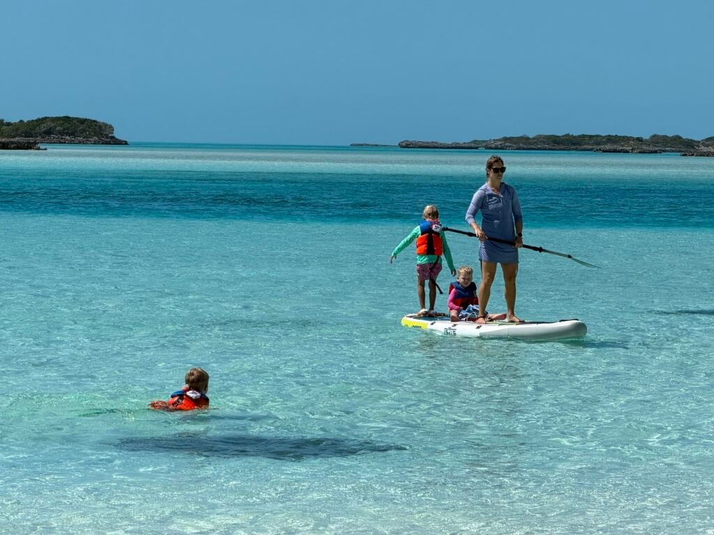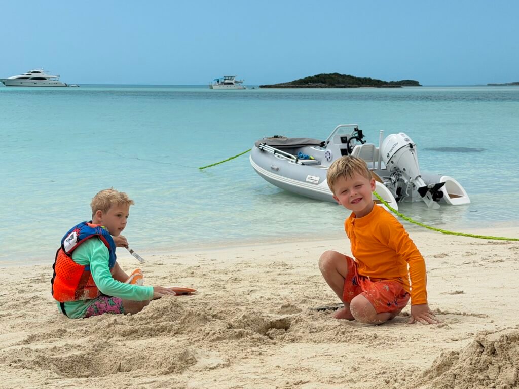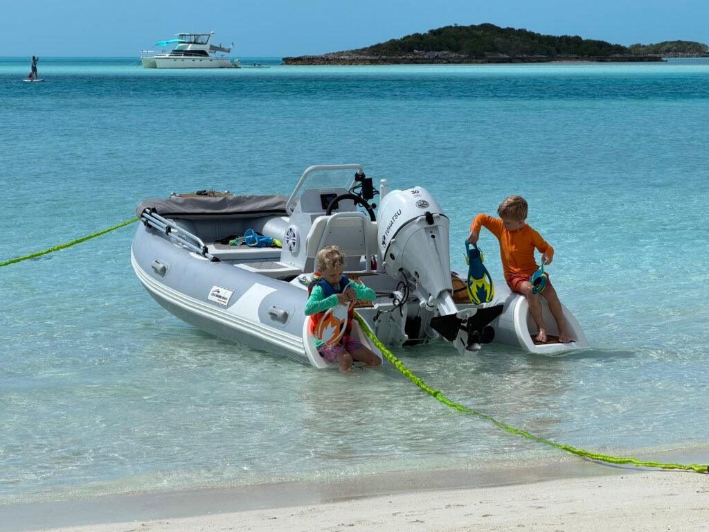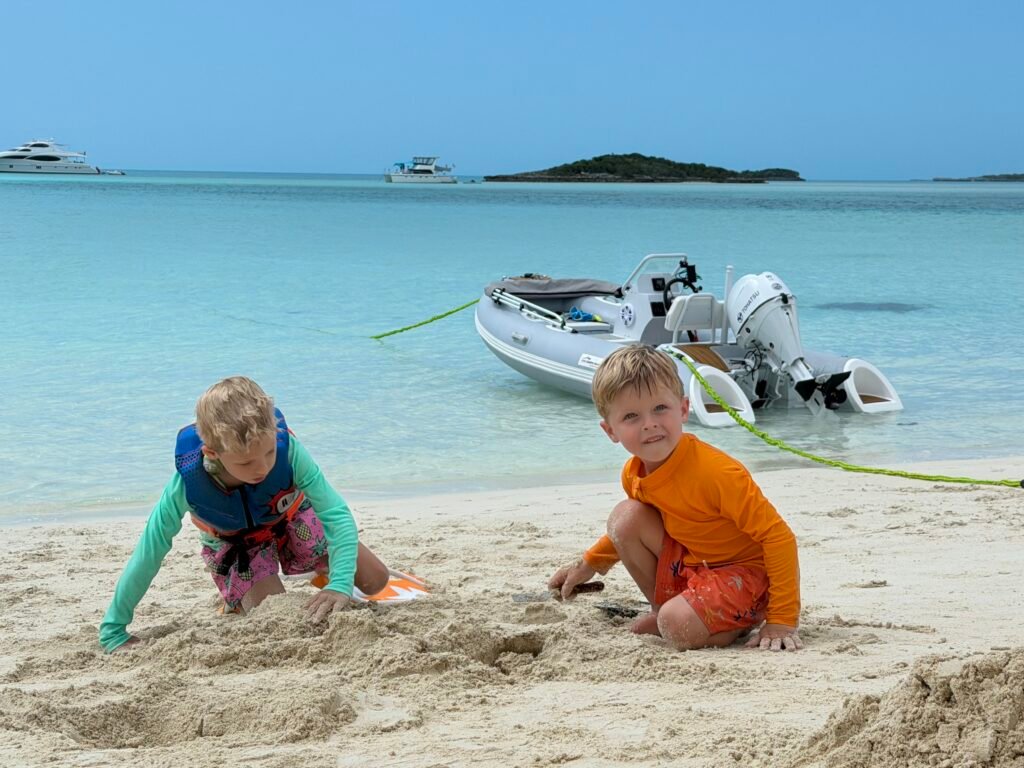 We loved our time in Staniel Cay, but eventually it was time to move on. We took the dinghy into the Staniel Cay Yacht Club for diesel and gas, then pointed south toward Little Bay on Great Guana Cay. Upon arrival, our buddy-boat neighbor, Frank, hopped in the water and helped me scrub the hull. We set up our forward sunshade for the first time before Pamela and the boys paddled to shore to explore, while I stayed back to tackle a few boat projects in the quiet.